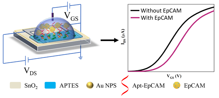 该工作使用溶胶-凝胶法制备的SnO2薄膜作为沟道材料,成功开发了一种新型的SnO2液栅薄膜晶体管(SGTFT)生物传感器,用于特异性检测EpCAM蛋白。通过选择最佳厚度的100 nm SnO2薄膜作为通道材料,其跨导(gm)达到1432μS,阈值电压(Vth)稳定在0.288 V。通过适配体和EpCAM之间的特异性识别,触发栅极电压变化以调节器件的沟道电流。制备的SGTFT表现出高检测灵敏度(14.6 mV·dec-1),检测限(LOD)低至24.4 pg/mL,并且用于EpCAM传感的校准曲线在0.02 ng/mL-500 ng/mL范围内。开发的SnO2-SGTFT生物传感器有望为健康监测和疾病诊断提供一种新的高灵敏度和特异性的检测平台。