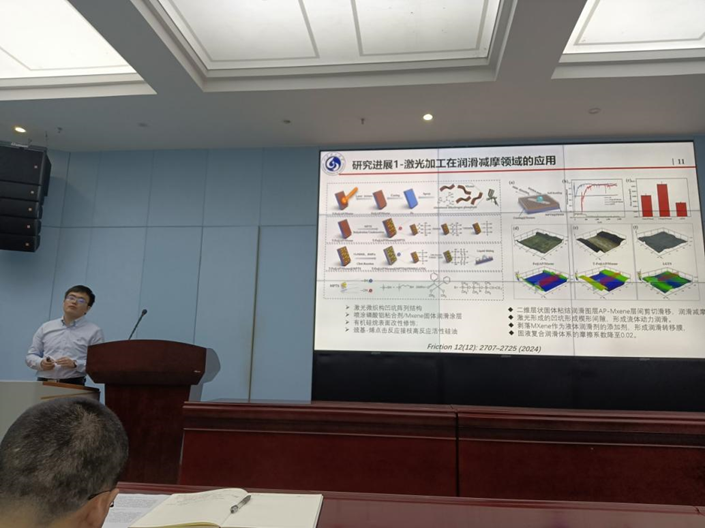 刘明明教授在报告中指出,超快激光技术正以皮秒/飞秒级精度突破传统表面加工的物理限制,其核心优势在于“非接触加工与高可控性”。通过仿生设计与激光微纳结构结合,刘教授团队开发出多功能工程表面。他以润滑技术为例解释,“仿生鱼鳞梯度结构协同液体润滑剂,摩擦系数可低至0.02,并有效提升油膜的承载力。”随后,他从润滑减摩、能源传感、液体操控、污水处理及材料防护等五个方面,详细介绍了超快激光技术在不同行业中的应用前景及研究成果。本次报告以先进技术与生动案例的展示,为yl23455永利官网师生呈现了超快激光技术的跨学科应用潜力,进一步激发了师生在材料表面工程和仿生摩擦学等领域的创新活力。