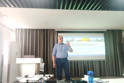 报告中,Peter J. Klar教授以全球能源需求快速增长与绿色能源节约高效利用为切入点,系统阐述了热致变色氧化钒(VO2)材料独特的金属-绝缘体相变特性及其在节能智能窗领域的应用前景,重点报告了其团队在该领域的主要研究进展。针对VO2材料产业化过程中面临的光学性能优化与规模化制备难题,其研究团队创新性提出多层膜结构解决方案:通过在VO2功能层上下分别引入减反层和缓冲层,实现了具有高可见光透过率和强太阳能调制能力VO2薄膜的制备。此外,其团队通过引入TiO2:Cu薄膜为缓冲层,成功将VO2薄膜生长温度降至300°C,为VO2薄膜工业化大规模生产提供了可行性。整场报告学术氛围浓郁,在互动交流环节,与会师生围绕VO2在智能窗应用方面面临的关键技术问题,积极与Klar教授展开深入探讨。最后,报告会在热烈掌声中圆满结束。