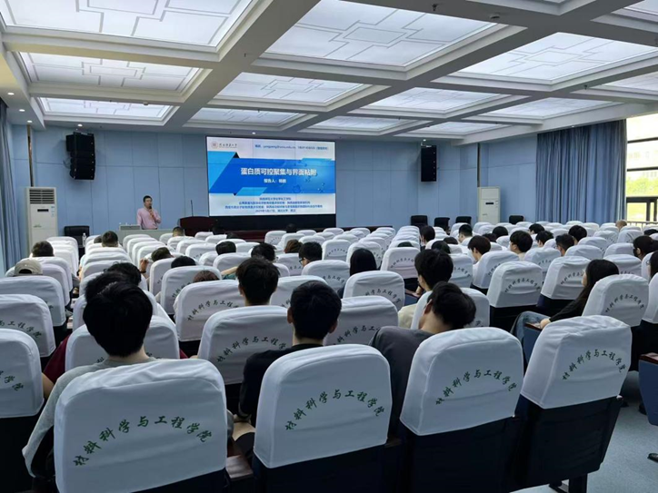 报告以“类淀粉样蛋白质组装及表界面改性”为题,杨鹏教授围绕如何实现高效控制类淀粉样蛋白在表界面处有序组织这一科学问题,阐述了类淀粉样蛋白质可控聚集的机理、蛋白质纳米膜结构与性能调控方式。提出了超快速类淀粉样蛋白质聚集的新策略,可实现低成本、快速和批量制备蛋白质超分子材料,初步建立以蛋白质为主要原料的可持续发展材料和技术体系,低成本、快速和批量制备相转变蛋白质聚集体材料,这种材料具有优异的无色透明性、界面粘附稳定性和生物相容性。杨教授也介绍了蛋白质可控聚集体系在生物医用涂层、水处理吸附材料、新型生物农药等方面的特色应用。本次报告为师生提供了该领域前沿的学术见解,拓展了研究生们的科研视野。
