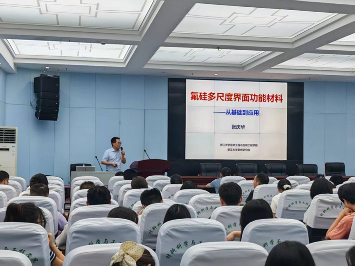 报告以“氟硅多尺度界面功能材料”为题,张庆华教授围绕如何实现氟硅多尺度界面功能材料表界面分子设计与调控这一科学问题,通过使用界面与合成化学的手段,制备了系列具有多尺度结构与特殊浸润性能的氟硅界面功能材料,建立了界面功能材料的表面性能与其结构、化学组成之间的关联机制。基于微结构与化学组成的协同调控与优化,实现了材料表面物理化学性能的显著提升,解决氟硅界面功能材料规模化制备与界面稳定性问题,拓展了在自清洁涂层、分离膜改性、海洋防污、锂电池与新能源等领域的应用。本次报告为师生提供了该领域前沿的学术见解,拓展了研究生们的科研视野。