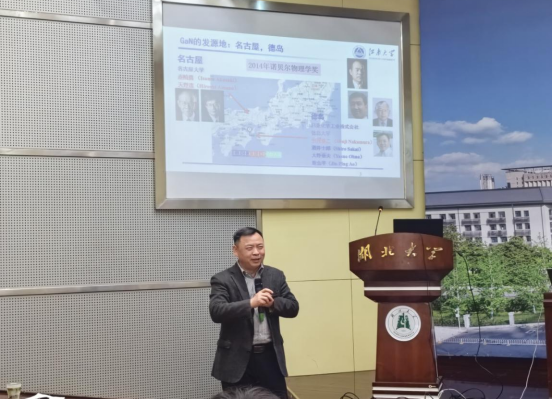 在报告会中,敖金平教授首先概述了氮化镓材料及器件的研究发展历程,接着重点阐述了其团队在氮化镓射频功率器件研制及其应用方面的重要进展和创新成果。报告主要涉及敖教授团队在设计和制造GaN肖特基二极管和微波整流器,及其在低功率微波无线能量传输方面应用的最新研究进展。敖教授的报告引起了参会师生的热烈反响,交流环节中,师生们踊跃提问,敖教授逐一进行了耐心细致的解答,报告会在浓郁学术氛围和热烈掌声中圆满结束。报告会后,yl23455永利官网何云斌教授邀请敖教授参观了湖北省先进光电转换与光电催化材料国际科技合作基地和湖北大学先进宽禁带半导体材料与器件研究中心,并详细介绍了国合基地及研究中心近年来的主要工作进展,双方就未来合作事宜进行了深入探讨。