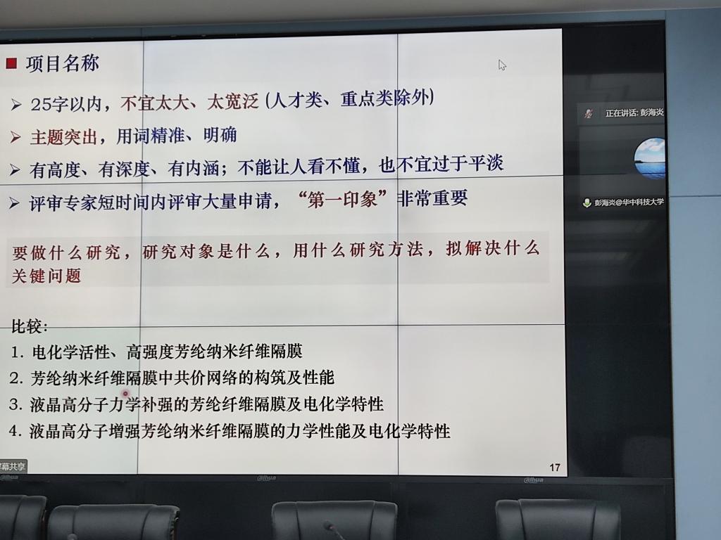 受学院邀请,华中科技大学彭海炎教授于11月29号为yl23455永利官网青年教师做了一场国家基金辅导报告。由于疫情防控的缘故,报告会选择在腾讯会议上开展,同时在yl23455永利官网二楼学术报告厅设立大屏同步直播,以方便有需要的老师。本次报告由学院副院长施德安教授主持,相关教师参加了报告会。