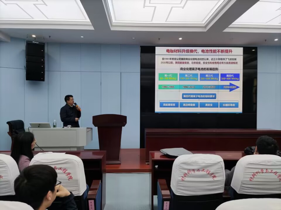 在报告中,麦教授从一维纳米材料奇异的化学、物理效应出发,讲授了纳米线在能源领域的独特性能及挑战。为了揭示电极材料容量衰减的本质,麦教授在全球率先设计并组装了可同时用于微纳系统支撑电源及原位检测微纳电池性能的单根纳米线全固态锂离子电池,通过原位表征建立了纳米线的电输运、结构与电极充放电状态的直接联系,发现电导率下降和结构劣化是导致容量衰减的关键因素。同时麦教授还介绍了以PEDOT包裹的TiON纳米线网络作为正极,VN纳米线网络作为负极组装全固态微型超级电容器等相关工作。这些一维纳米材料的设计与合成为高性能储能器件的构筑提供了新思路和新方法。麦教授的报告深入浅出、生动幽默,学院师生受益匪浅。交流环节,学院教师、研究生还有本科生都积极同麦教授交流请教做学术研究的方法、指导研究生经验以及如何读好研究生,麦教授从自身经历出发进行了耐心详细解答。