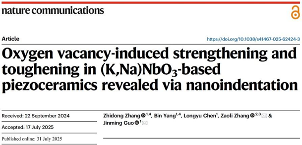 近日,湖北大学yl23455永利官网郭金明教授团队在国际期刊《Nature Communications》发表题为《Oxygen vacancy-induced strengthening and toughening in (K,Na)NbO3-based piezoceramics revealed via nanoindentation》的研究成果。湖北大学为第一单位,硕士研究生张志东和博士研究生杨滨为论文共同第一作者,湖北大学郭金明教授、奥地利科学院张灶利教授为共同通讯作者(图1)。