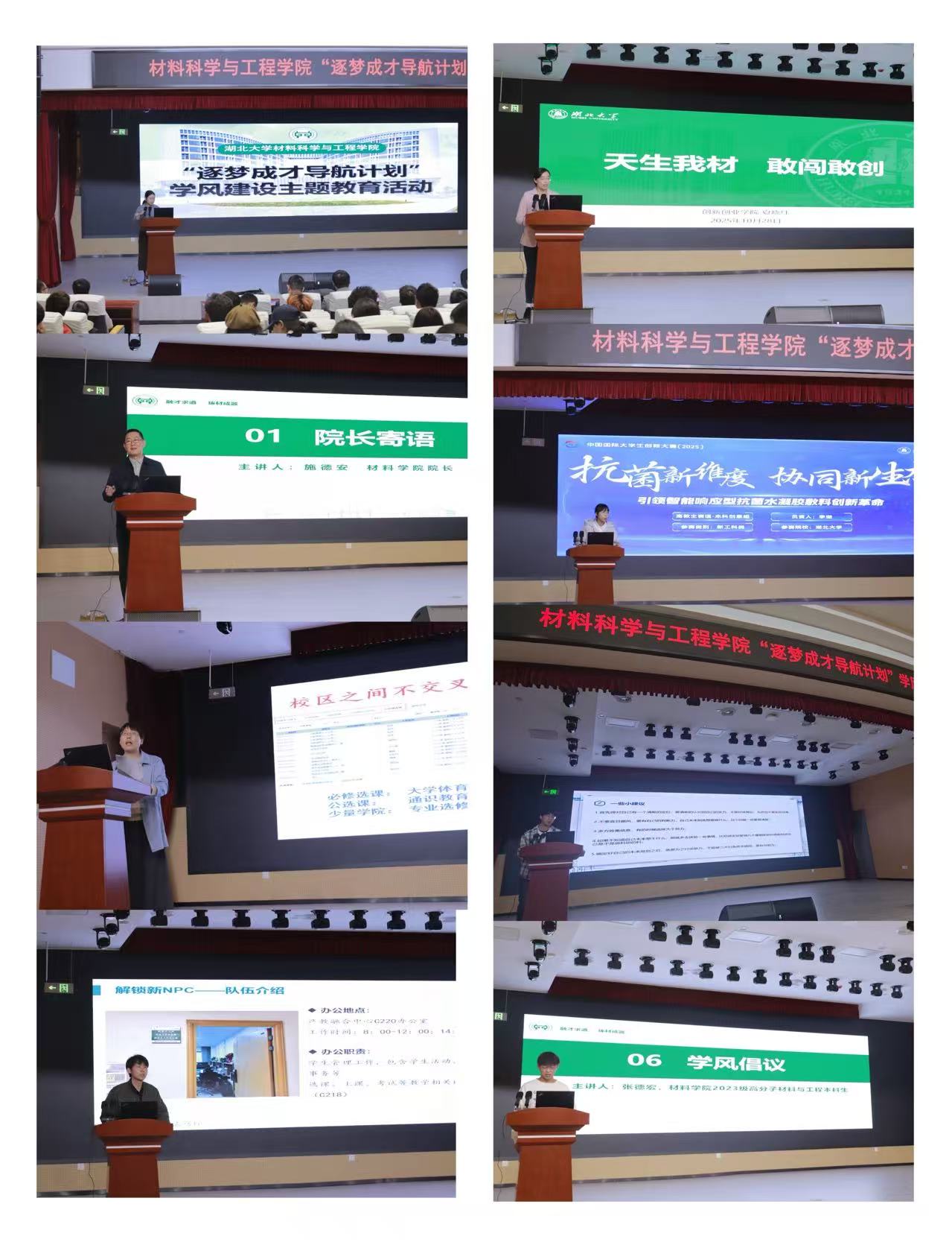 10月28日晚上18点,材料学院“逐梦成才导航计划”学风建设主题教育活动在长江新区校区产教融合中心报告厅顺利举行。创新创业学院院长、楚才学院院长夏晓红,材料学院院长施德安,党委副书记鲁力格格,副院长尤俊等领导出席活动,学院全体2024、2025级共442名本科生参会,活动由学院党委副书记鲁力格格主持。