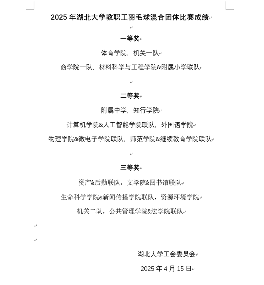 4月15日下午,由校工会举办的湖北大学“2025年湖北大学教职工羽毛球混合团体比赛”在三号体育馆圆满落幕。羽毛球比赛为湖北大学品牌赛事之一,由校工会主办,教职工羽毛球协会协办。经过七天激烈角逐,yl23455永利官网与湖北大学附属小学联队取得历史最佳战绩,获一等奖。