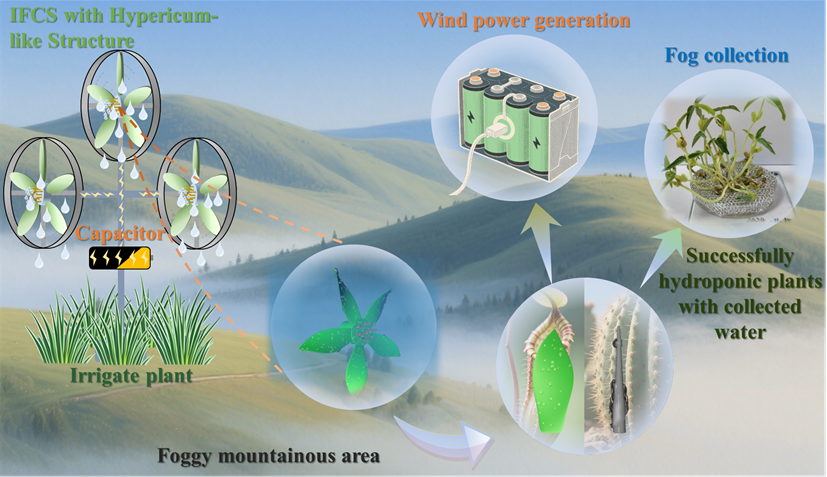 在全球高山多雾地区,水资源短缺和能源不足成为亟待解决的挑战。这一背景推动了仿生技术在雾收集系统中的创新应用。受金丝桃花中双雄蕊结构的启发,本研究设计了一种集成雾收集系统(Integrated Fog Collection System, IFCS),实现了仿生液滴捕获与摩擦电风能收集的创新协同作用。该系统采用铜针模拟“花蕊”结构,以实现高效的液滴捕获。同时,结合超滑移风车叶片技术,实现了液滴传输和风能生成的协同效应。为提升系统性能,研究对铜针阵列的润湿性和空间布局进行了系统研究,并根据贝兹极限对超滑移风车叶片的几何结构进行了优化。因此,IFCS展现了高效的雾收集效率(0.249 g.cm-2.min-1)和稳定的输出电压(0.513 V)。最后,通过水培植物实验和户外环境发电实验,验证了IFCS在复杂工作条件下的环境适应性和耐久性。实验结果表明,IFCS不仅具有良好的耐久性,而且具有一定的实际应用前景。研究为雾水收集系统中的协同增强和适当耦合提供了参考,并为未来多功能雾水收集系统的开发提供了一个设计模型。
