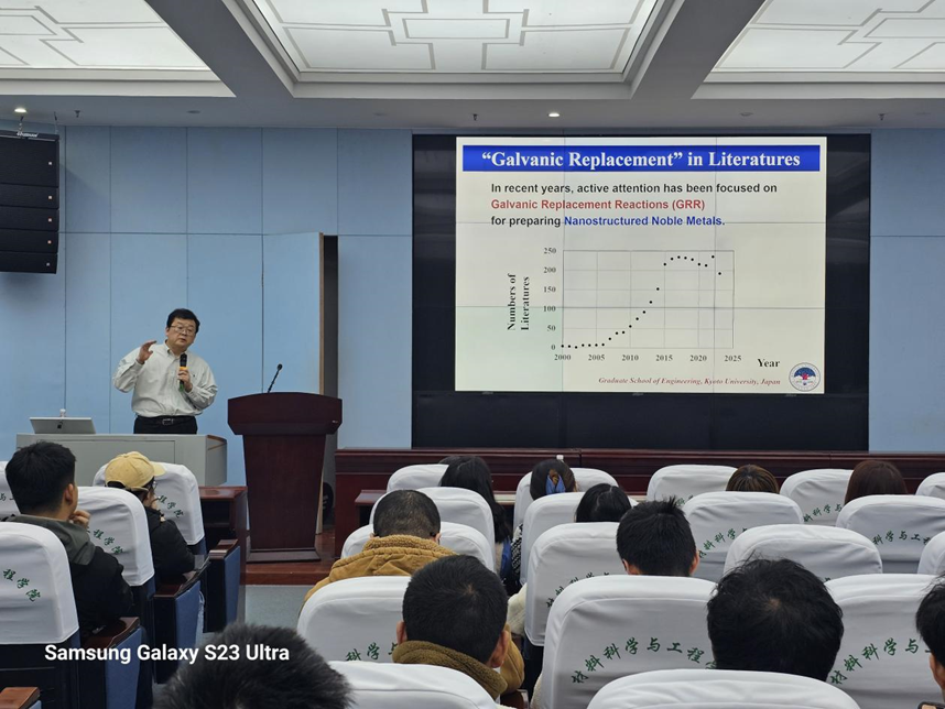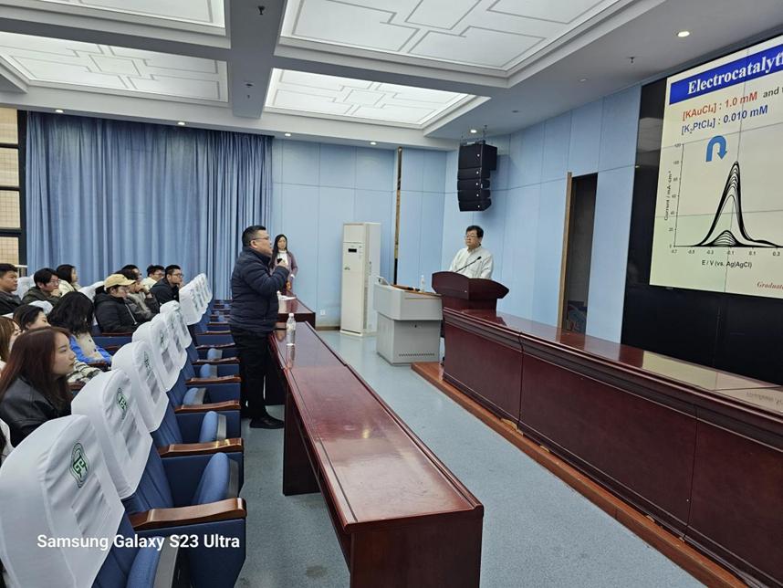 Munetaka Oyama教授以其深厚的学术造诣,发表了题为“Noble Metal Nanoelectrocatalysts Prepared by Galvanic Replacement Reactions”的精彩报告。报告中,Munetaka Oyama教授介绍了通过取代反应制备新型贵金属纳米材料。Munetaka Oyama教授通过丰富的实验数据,展示如何通过简单的取代反应,在金属衬底表面制备单金属、多金属以及核壳结构复合纳米金属材料,并研究了上述金属复合纳米材料对于燃料电池中醇类小分子的电催化。Munetaka Oyama教授详细的讲解,使学院师生受益匪浅。学院师生对Munetaka Oyama教授的工作十分感兴趣,大家积极提问,Munetaka Oyama教授耐心解答。最后,报告会在浓郁的学术氛围和热烈的掌声中结束。