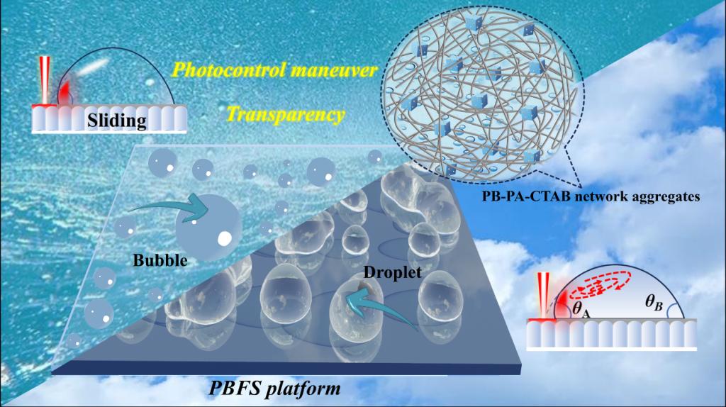 液体和气泡的定向运输和收集在自然系统的生存中起着至关重要的作用。其中光响应操控以其高度远程操作性、快速响应、可编程性等特点在微流体芯片、生物医学工程和化学合成等领域具有广泛的应用场景。然而传统的近红外吸收材料由于透光性较差,在可视化领域和穿戴设备发展方向上受限,制造能够在单个平台上执行各种功能(合并和混合)和定向移动液滴/气泡的操作平台的报道较少。在此,我们制备了一个透明光响应PBFS平台用于液滴和气泡操控,即在刻蚀后的玻璃片基底上涂覆普鲁士蓝(PB)纳米立方体。PB-PA NPs上的PA通过静电吸引与CTAB相互作用,形成PB-PA-CTAB网络聚集体。它们的重力沉积和PA与玻璃基底的同步表面粘附可以生成PB-PA-CTAB涂层。随后将涂层表面进行超疏水改性和注入润滑剂,得到透明的PBFS超滑平台。由于Fe(II)和Fe(III)之间的电荷转移跃迁,PB基纳米材料在近红外(NIR)区域具有很强的光学吸光度,表现出优异的光热转换性能。当近红外(NIR)照射到PBFS平台时,PB纳米立方体通过光热方式触发产热。随着温度的升高,液滴和气泡受到马兰戈尼作用力导致液滴左右两侧表面张力不均匀,形成表面张力梯度,从而驱动液滴和气泡进行移动,从而实现液滴和气泡的运输。本研究在微化学反应和生物医学工程等领域具有优异的应用潜力,为急需透明化光热材料的领域带来了全新的解决方案。