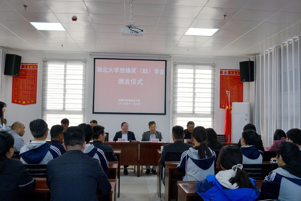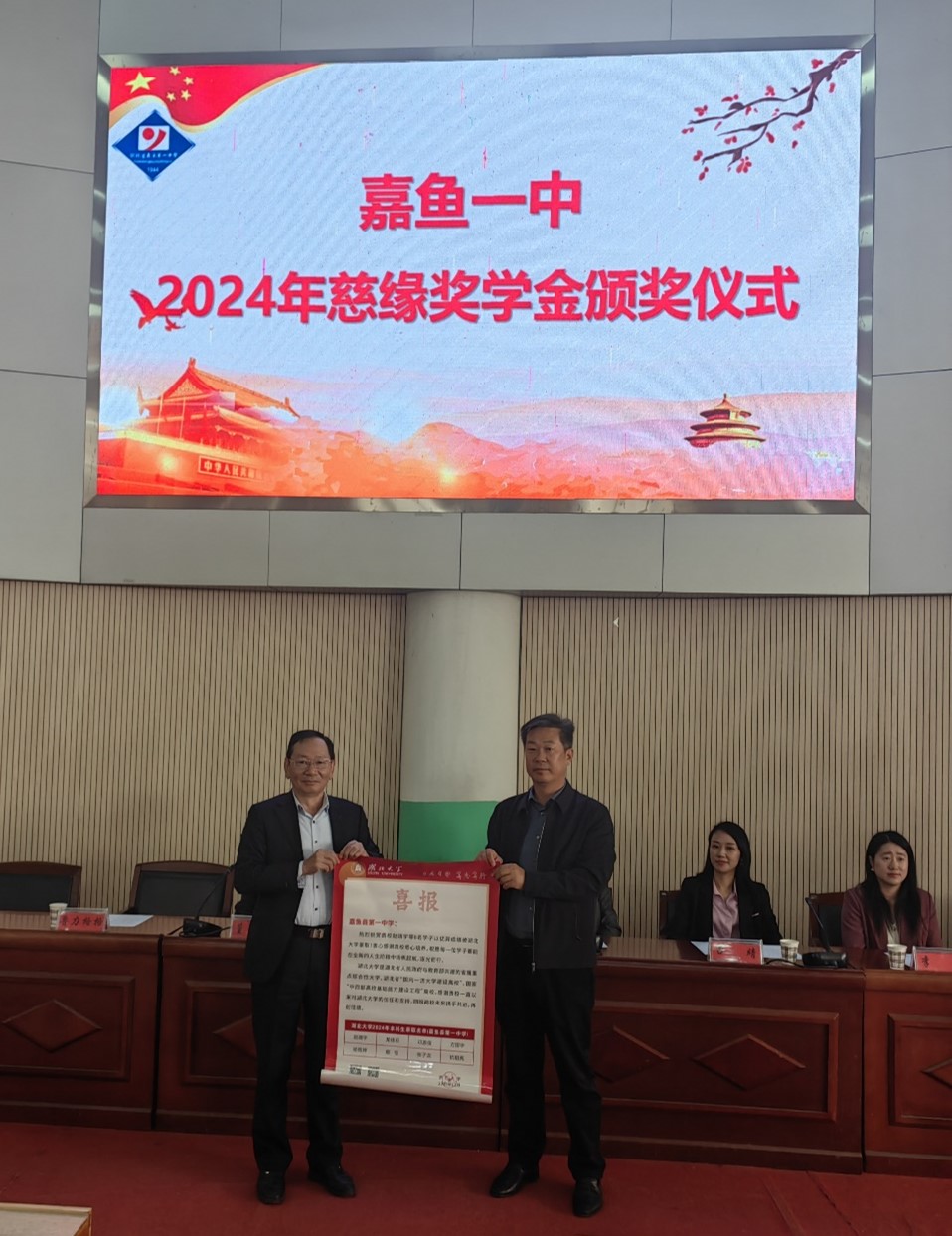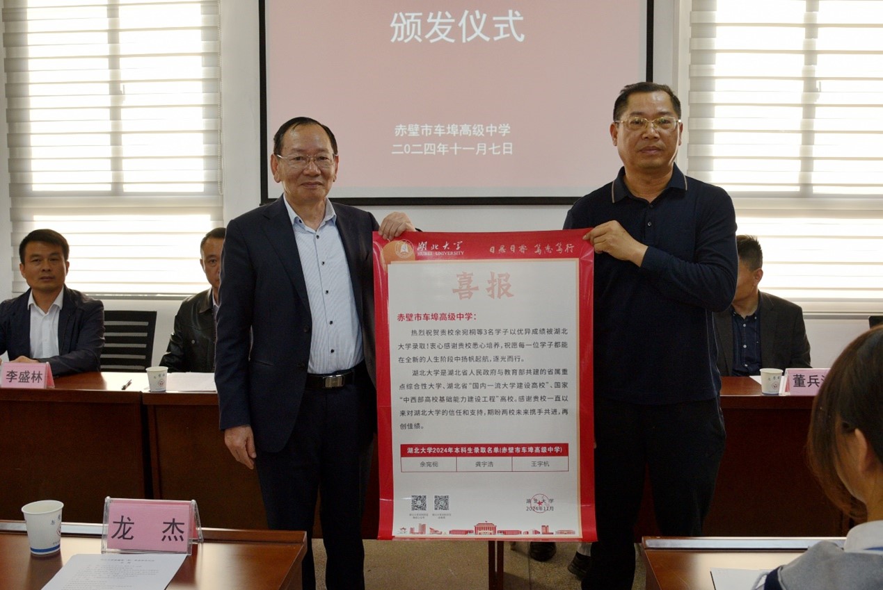 慈缘奖学金发起人叶正涛教授以及捐助人王世敏教授、董兵海教授,一同为两个学校共计二十四名学生颁发奖学金,并勉励同学们刻苦学习,以优异的成绩回报家庭和社会。王世敏教授为两所高中送去了2024年湖北大学录取喜报。