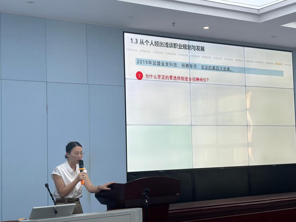 金发科技集团的招聘负责人黄宝莹作为特邀嘉宾,成为了本次大会的亮点之一,她结合自己的亲身经历,生动讲述了如何发现自身优势,找到适合自己的职业道路。她鼓励同学们深入剖析自己,以此作为基础选择适合自己的职业方向。此外,黄经理还详细介绍了如何优化简历,并站在专业的角度向学生介绍了HR是如何看简历的。