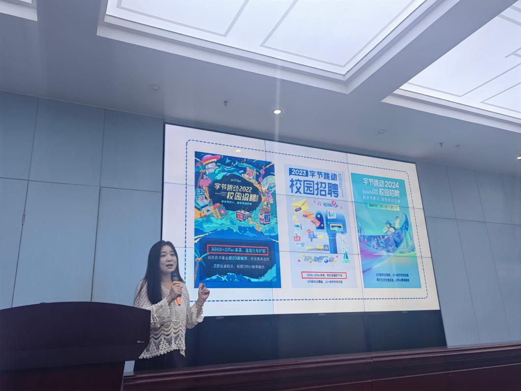 随后,祝晓静老师为学生带来了一场深入浅出的就业动员演讲。她从当前的就业形势分析入手,结合丰富的数据和案例,为毕业生们详细解读了就业市场的最新动态及趋势。祝晓静表示,虽然市场竞争激烈,但机遇同样并存,鼓励学生抓住当前秋招的最佳时期。