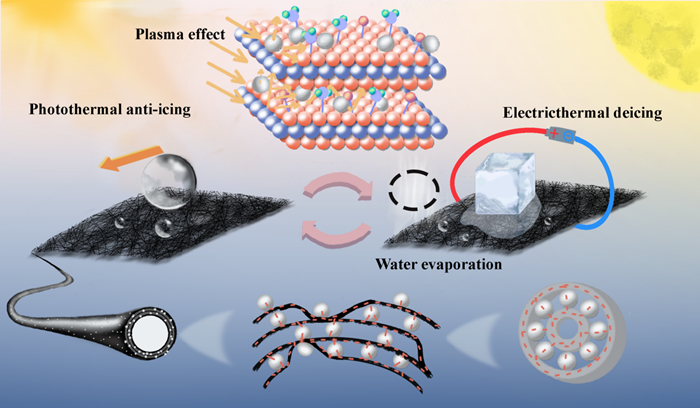 近年来,智能纺织品受到了广泛的关注,多功能可穿戴纺织品可以模拟人体感知并将其转化为可视化数据,具有良好的应用前景。其中,热管理纺织品作为一个重要分支,在除冰防冰领域受到广泛关注。受轴承结构启发,该研究团队在PET纺织品纤维上构建了以Ag NPs为导电连接点,以单层或少层MXene作为导电片层的导电网络。根据等离子体效应,Ag NPs和MXene的协同作用导致材料的光反射减少和光吸收增强。通过在纺织品上的单层MXene之间插入Ag NPs,一方面,通过在MXene层之间沉积Ag NPs,建立了一个以Ag NPs为连接点的导电网络。另一方面,单层MXene被贵金属颗粒隔开,有效缓解了MXene之间的堆叠。此外,PDMS改性赋予了纺织品良好的疏水性和耐酸性。氙灯光源的照射下,在一个太阳光强下该纺织品可以稳定在70-80 ℃。而在3 V的恒定电压下,平衡温度可以达到117 ℃。