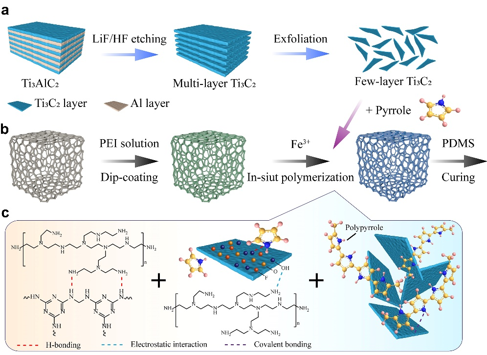 然而,以上工作只能实现在日间的原油回收,具有一定的时间局限性。基此,为了实现日间和夜间的全天候回收过程,该团队利用物理-化学交互的方法在三聚氰胺海绵上成功地负载了聚吡咯和MXene纳米材料,经过PDMS修饰后成功地实现了超疏水改性,该材料展现出了优异的光/电热的协同效应和高效的原油回收能力,如图3。
