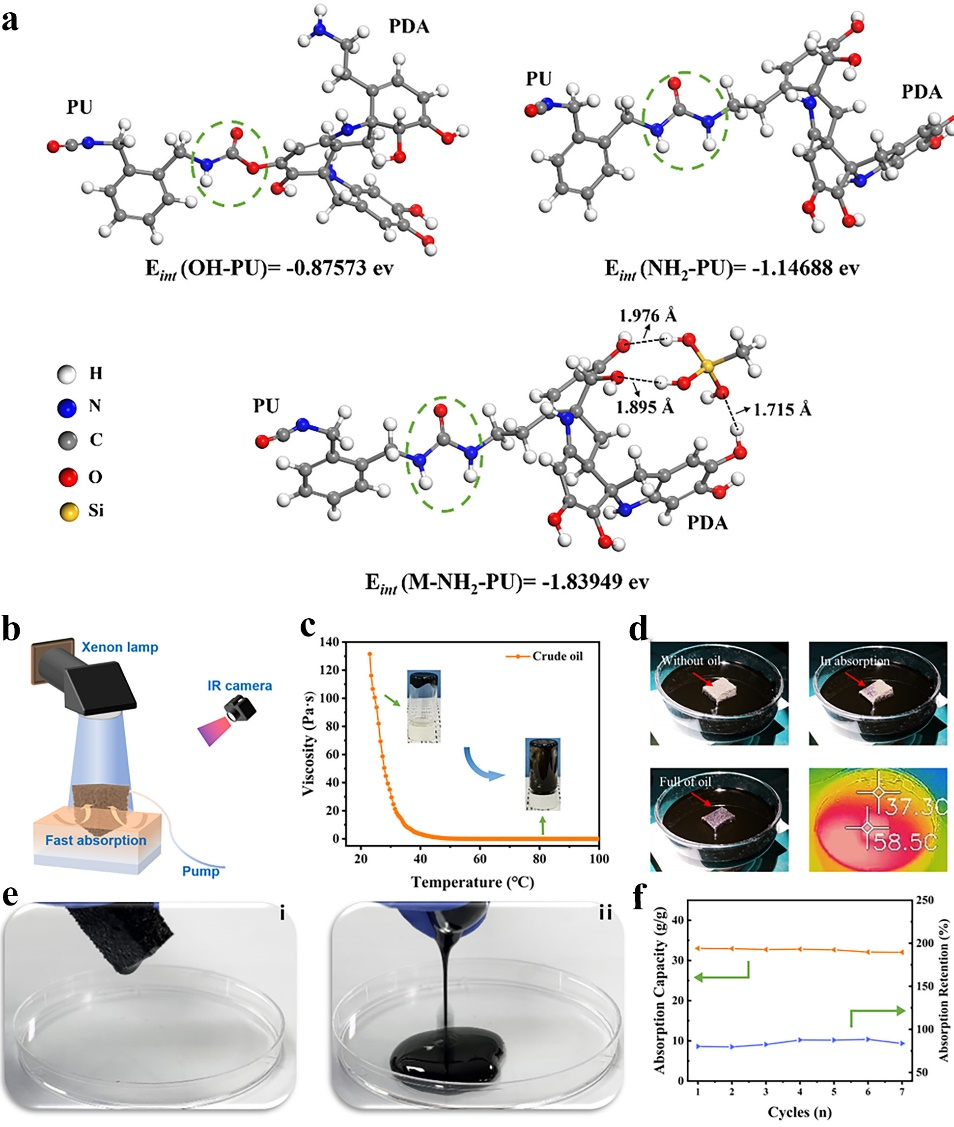 采用密度泛函理论对聚多巴胺上的官能团与聚氨酯海绵上的异氰酸酯基团之间的反应能做出合理计算,结果表明水解的甲基三甲氧基硅烷加入后会使M-NH2-PU之间的反应能会升高,说明水解的甲基三甲氧基与聚多巴胺单体上的儿茶酚基的三氢键作用为界面的快速组装提供了动力,如图2。通过氙灯模拟自然界的太阳作为光源,该材料的优异光热转化能力使上表面温度在一个太阳光强下3分钟内上升至99 ℃以上,并且在10次光照测试循环中可以保持稳定的界面加热性能。同时,该材料具有稳定的机械性能,经过200次机械挤压和多次摩擦测试后,该材料仍然具有稳定的疏水性能和光热转化性能。由于该海绵保持了高的孔隙率,它的原油吸附量可达33 g/g,保留率达80 %以上。总之,由于其低成本的原材料和简单的制造方法,结合其机械稳定性、优异的吸附能力和光热转换性能,该海绵在实际应用方面具有很高的吸引力。