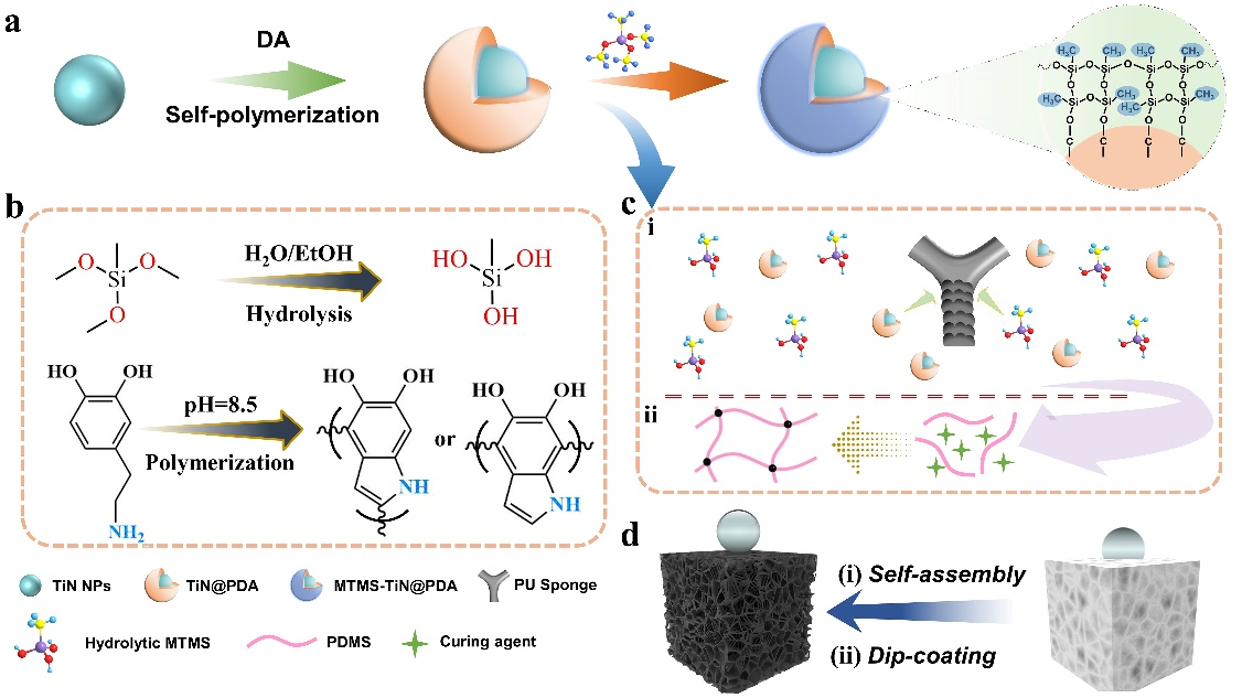 对于单一太阳能驱动模式,该团队提出了一种受贻贝启发的超疏水海绵的制备,如图1。采用聚多巴胺包裹的TiN纳米颗粒作为光热媒介,它在水解的甲基三甲氧基硅烷溶液的作用下被自组装于聚氨酯海绵骨架表面,形成具有一定粗糙度的表面,经过PDMS修饰后成功实现了超疏水改性,并具备优异的光热转化能力和原油吸附性能。