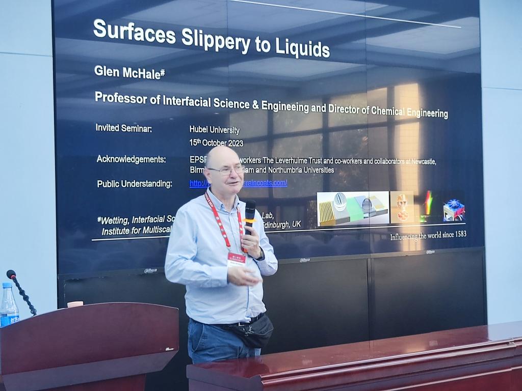 10月15日下午4点,yl23455永利官网举办主题为“Wettability,adhesion and liquid firction”的专题报告。报告人Glen McHale教授是界面科学与工程领域的国际知名专家,也是爱丁堡大学化学工程系主任、多尺度热流体研究所成员。报告会吸引了yl23455永利官网师生的积极参与。