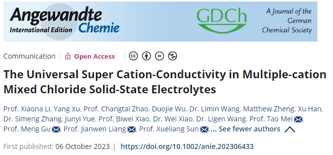 近日,湖北大学yl23455永利官网梅涛教授与宁波东方理工大学(暂名)孙学良院士、谷猛教授,有研(广东)新材料技术研究院梁剑文研究员以共同通讯作者身份在国际顶级期刊《Angewandte Chemie International Edition》上发表了题为《The Universal Super Cation-Conductivity in Multiplecation Mixed Chloride Solid-State Electrolytes》的研究成果,东方理工副教授李晓娜、湖北大学硕士研究生徐洋与有研(广东)新材料技术研究院赵昌泰研究员为论文共同第一作者。
