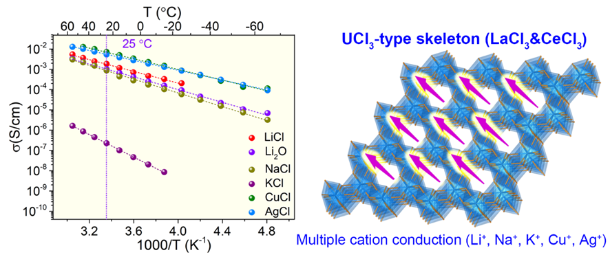 作者团队以UCl3型结构为主体,合成了具有高离子电导率的新型多阳离子混合氯化物SSEs,研究了不同金属种类的不同组成对离子传输性能的影响。 利用丰富的Al、La、Ce和Zr以低成本制备多种具有成本效益的超过10-3S/cm的高锂离子电导率多阳离子混合氯化物SSEs。这些多阳离子混合氯化物SSE还与氧化物正极材料具有良好的相容性和宽电化学窗口,使ASSLB能够在室温(3000次循环)和-30°C(390次循环)下稳定循环。 我们的工作强调,在阳离子位点内产生更多的构型无序是促进Li+快速迁移的重要策略。更重要的是,阳离子无序效应导致普遍的单价传输(Li+、Na+、Cu+等),负载Cu+和Ag+的材料各自表现出7.13×10-3和7.75×10-3S/cm的高离子电导率。多阳离子混合氯化物SSEs的突破归因于通过独特通道结构的快速单价传输和非晶态组分。我们的研究进一步丰富了UCl3型SSE家族,并期望我们的研究将有助于确定高性能电池SSE的新方向。