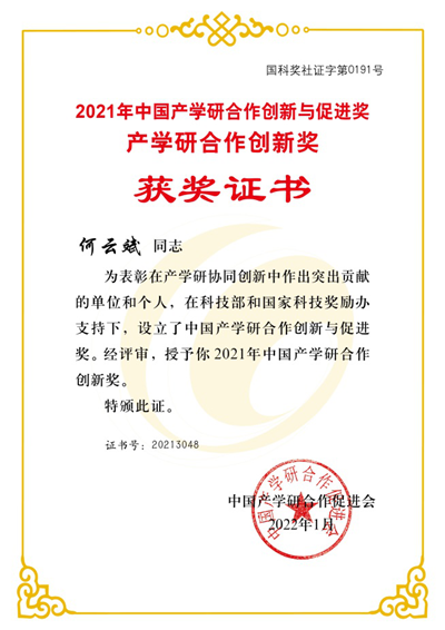“中国产学研合作创新与促进奖”经科技部和国家科技奖励工作办公室批准,由中国产学研合作促进会设立,奖励为促进我国产学研合作创新作出突出贡献的单位、个人以及突出创新成果,是产学研界协同创新的最高荣誉奖。奖项分设创新奖、促进奖、创新成果奖、突出贡献奖4类,其中创新奖每次评选不超过100名,授予的单位及个人在产学研合作创新工作中成果显著,取得较大的经济效益和社会效益,推动了本行业、本领域的自主创新、技术进步,具有一定的示范和带动作用。