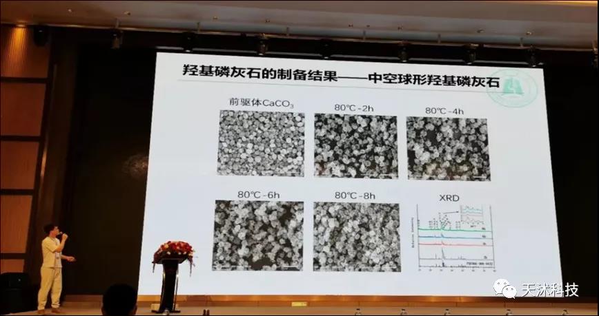 团队研究生朱凯在大会上作《中空球形羟基磷灰石骨修复材料的制备研究》报告。