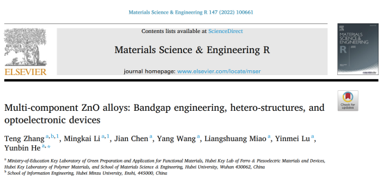 近期,何云斌教授团队有关氧化锌多元合金的论文“Multi-component ZnO alloys: Bandgap engineering, hetero-structures, and optoelectronic devices”正式在材料领域权威综述期刊——材料科学与工程:报告(MSE-R)上在线发表 (Materials Science & Engineering R 147 (2022) 100661)。湖北大学是该论文的第一署名和通讯单位。材料学院博士生张腾和黎明锴教授是论文共同第一作者,何云斌教授是论文通讯作者。