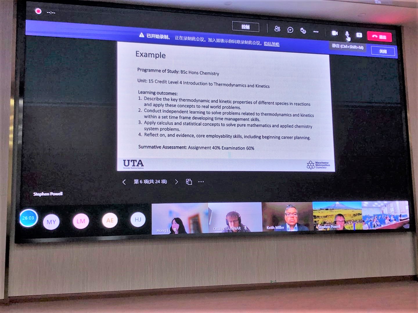 5月25日下午,材料化学中外合作办学教师参加湖北大学曼城联合学院教学研讨会。本次活动由湖大曼城联合学院主办,会议于湖大曼城联合学院三楼报告厅召开,采用视频会议的方式进行。会议听取了英国曼彻斯特城市大学理工学部副部长Keith Miller教授和Stephen Powell教授的报告,双方老师就两校在教学管理、教学设计、学生反馈等各方面的操作流程、管理规范、评价方式等进行了深入的交流。