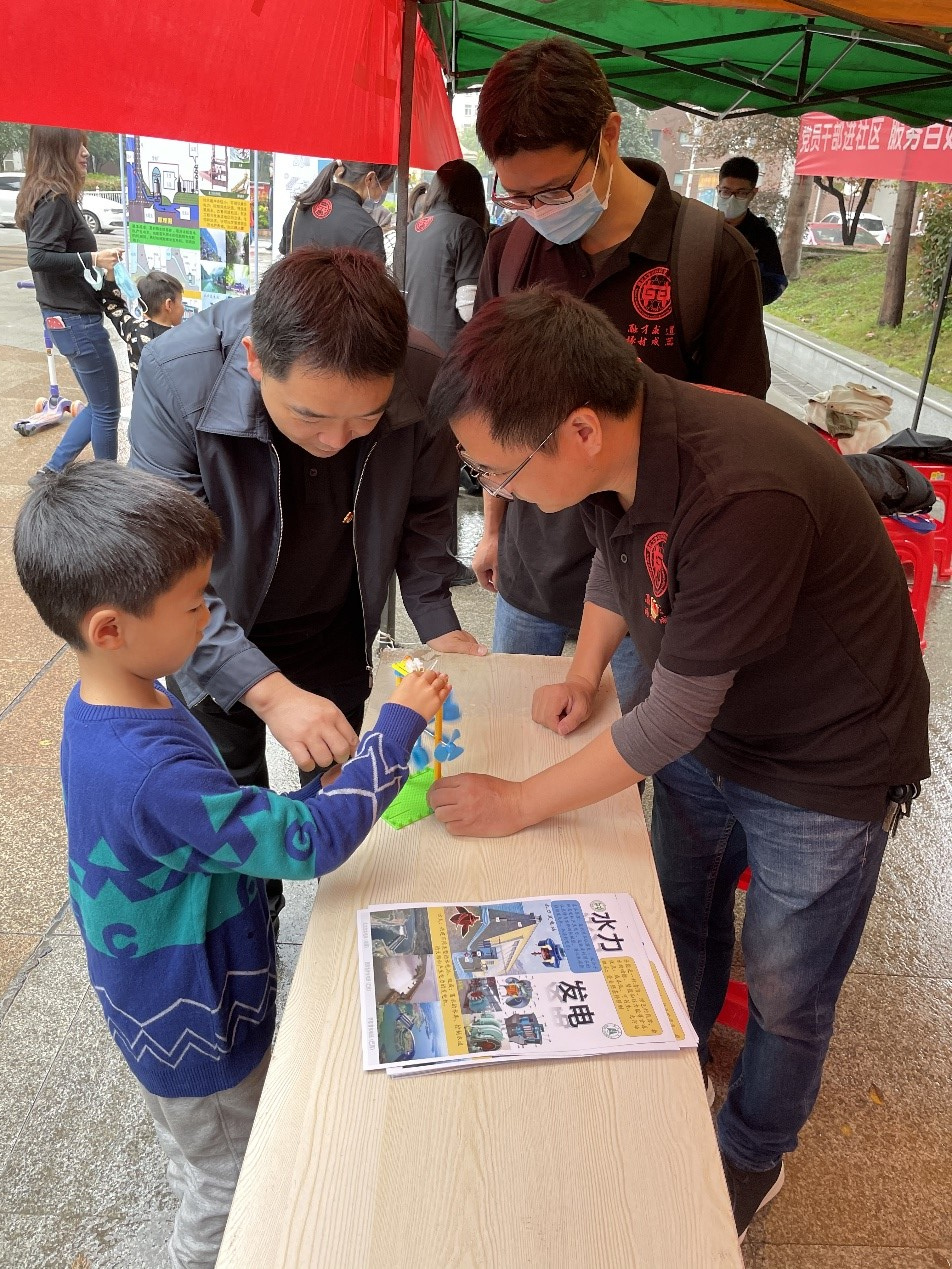 在全体党员面对党旗重温入党誓词后,分成四个展位进行宣讲及实验展示,主题分别为:太阳能发电、水力发电、风能发电、氢能发电,重点围绕新能源的存储及在生活中的应用进行宣讲。一号展位是宣传太阳能转化为电能和动能的装置,其中太阳能汽车与太阳能风车最具特色;二号展位负责水力发电部分;三号展位为风能发电的装置,形似飞机的转化装置最受居民欢迎;四号展位为氢能装置,以其新颖的外观圈了一波粉丝。