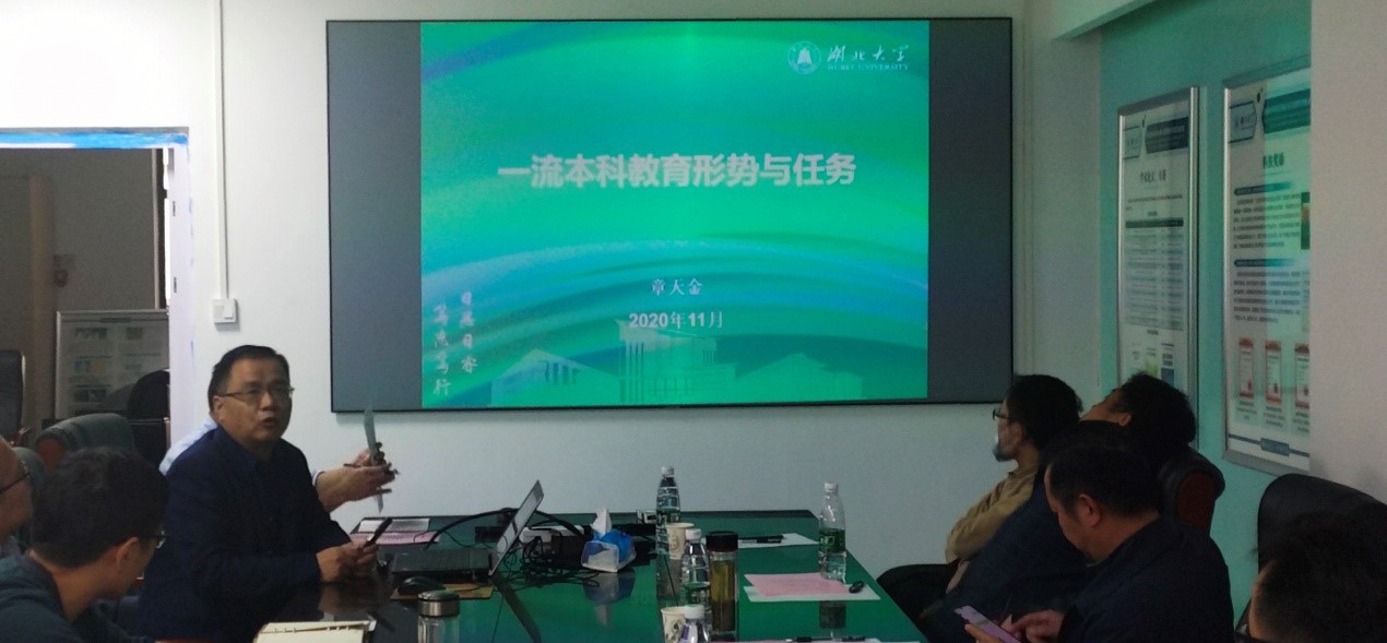 章天金做了题为“新时代一流本科教育形势与任务”专题讲座,提出中国本科教育进入新时代,要明确一流本科建设的新路径,提出变轨超车新概念,制定多项“双万”新举措,谋划“西三角”新布局,树立本科教育新理念,丰富高等教育新学理;指出一流本科教育任务的设计要切实落实四个会议精神、推进一流本科教育建设,加强教学改革与研究、重点培育国家级教学成果奖申报,深化创新创业教育,提升学生自主创新创业能力等系列任务;解读了《湖北大学加强在线开放课程建设应用与管理的实施办法》、《湖北大学一流本科教育“12310”模式》等政策文件精神,对专业改革和发展提出了建设性意见和建议。