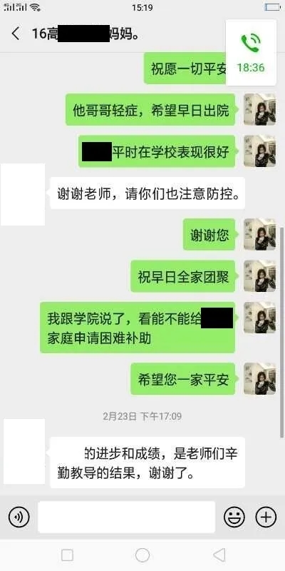 班主任刘念老师通过电话,微信家访,了解了学生在家里的身体和心理情况,确认学生及家长的健康情况,学生是否有外出现象。据了解,一位同学的哥哥确诊,已住院治疗,除哥哥之外的全部家人在酒店隔离。跟学院领导汇报后,学院为其申请了困难补助。其他学生及家长无感染新冠肺炎现象,学生表现良好,遵从当地制度,无外出。