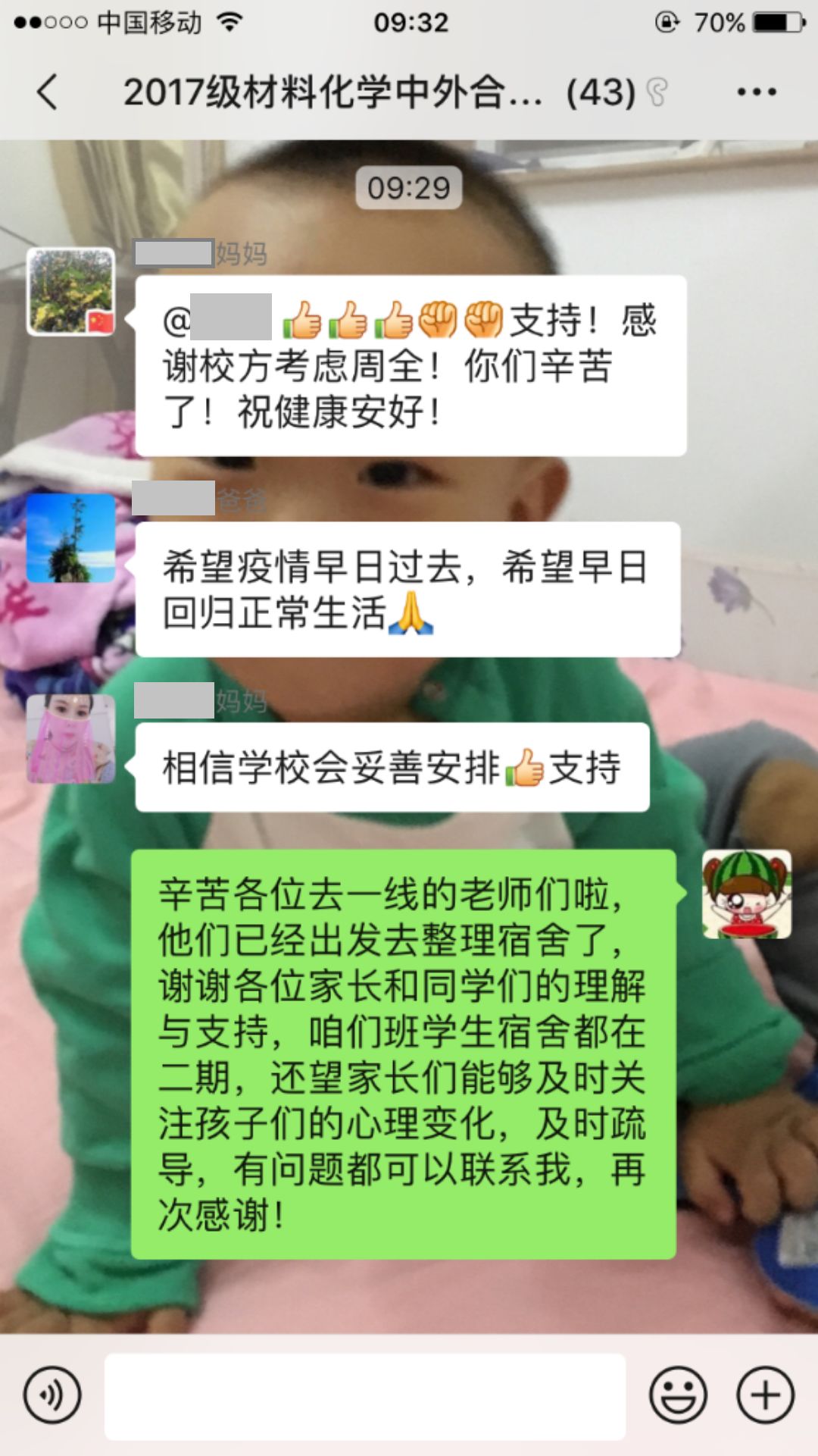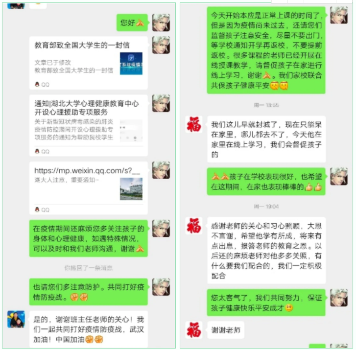 班主任首先给学生家长发送三个重要通知或文件给学生家长发送三个重要通知或文件《教育部致全国大学生的一封信》、《通知:湖北大学心理健康教育中心开设心理援助专项服务》、《湖北大学关于延迟2020年春季开学时间的通知》,强调疫情防控、在线学习和注意安全的重要性,并听从家长的建议,与之交流。
