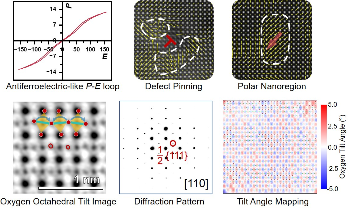 图2 类反铁电电滞回线和缺陷钉扎与氧八面体倾转的原子尺度分析结果