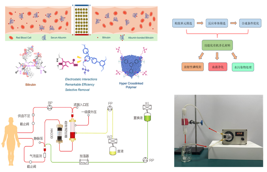 肝脏疾病是一种由肝功能受损乃至丧失而引发的重大疾病,严重危害人体健康。肝移植疗法存在供体短缺、成本高昂以及免疫排斥等局限。针对现有血液净化吸附材料吸附容量低、选择性差及生物相容性欠佳等不足,团队设计开发以超交联聚合物(HCP)和共价有机框架(COF)等多孔材料为核心的先进功能材料体系,通过分子设计与结构调控,致力于开发具有高比表面积、优异孔结构稳定性和可定制功能的有机多孔材料,拓展新型多孔材料在血液净化领域中的应用。该方法通过外部装置清除血液中毒害物质,实现低成本快速缓解患者病情。此外团队还开展了有机多孔材料在放射性碘吸附材、以及水污染物处理材料的研究,通过创新的多尺度设计策略,有效提升了有机多孔材料在复杂环境条件下的应用潜力。