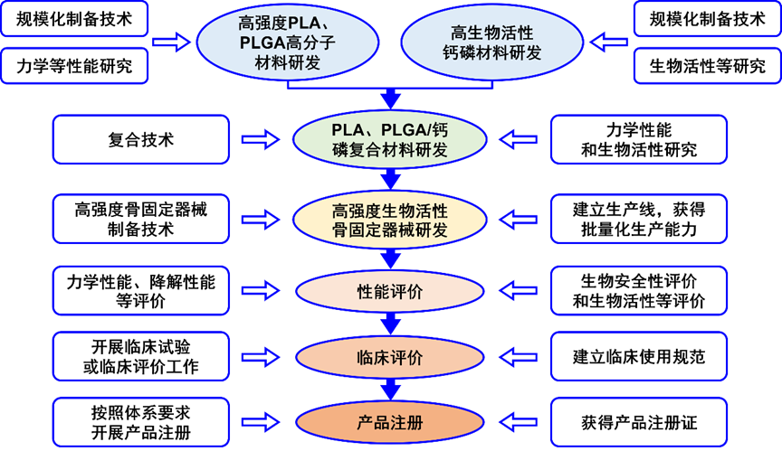 针对传统金属骨固定器械需二次手术取出、不可降解、生物活性不足的临床痛点,本方向致力于高强度可降解生物活性复合材料及骨固定器械的研发。以PLA、PLGA等可降解高分子为基体,HA、β-TCP等无机活性相为增强体,结合仿生矿化与Zn、Si、Mg等微量元素掺杂技术,构建Zn-HA/PLA、Si-HA/PLA、Mg-HA/PLGA、β-TCP/PLGA等新型复合体材料体系。通过精密注塑与熔融挤出调控微观结构,实现材料强度衰减与骨折愈合时间的良好匹配。搭建涵盖理化表征、降解性能、生物安全性与生物活性的全链条临床前评价体系,探究微量元素掺杂诱导成骨、促进组织再生的机制,解决现有可降解骨固定材料强度与生物活性难以兼顾的核心问题,为同类器械的临床前研发提供实验依据与技术支撑。