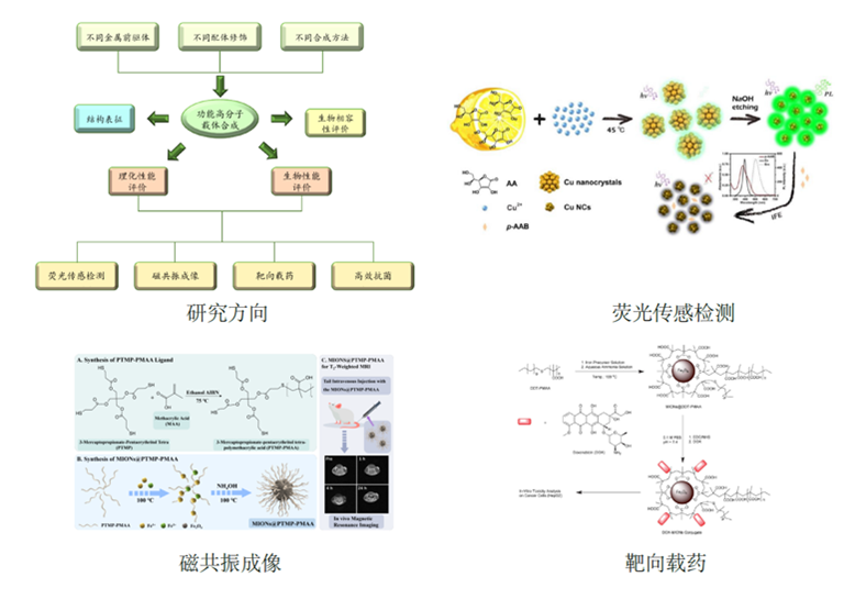 功能高分子载体是材料科学、高分子化学与生物医学交叉融合的前沿研究领域,核心在于通过精准分子设计,赋予高分子材料多样化应用功能。针对传统高分子载体存在合成可控性差,生物适配性弱和体内递送行为不可控等缺陷,本方向聚焦高分子载体精准智能响应及功能协同调控这一关键科学问题,依据聚合物配体结构的精准设计与功能调控,构建系列化功能高分子材料体系,可分别应用于高灵敏荧光传感、高分辨磁共振成像、精准靶向药物递送及长效抗菌等多个领域。通过细胞毒性、体外降解、生物相容性、体内分布、靶向富集程度等全方位体外、体内生物学评价,系统探寻材料的结构和性能之间的构效关系,推进其在精准检测、智能成像,靶向治疗等领域的成果转化,为高端生物医用材料的创新发展提供理论与技术支撑。