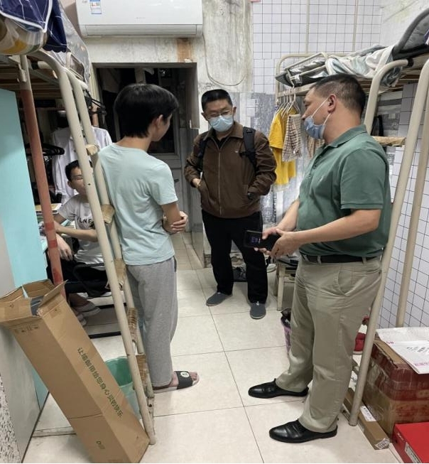领导老师们深入每个学生寝室,对学生表达亲切的慰问和关心,倾听同学们生活中所遇到的问题,并对存在的问题逐一进行了登记。